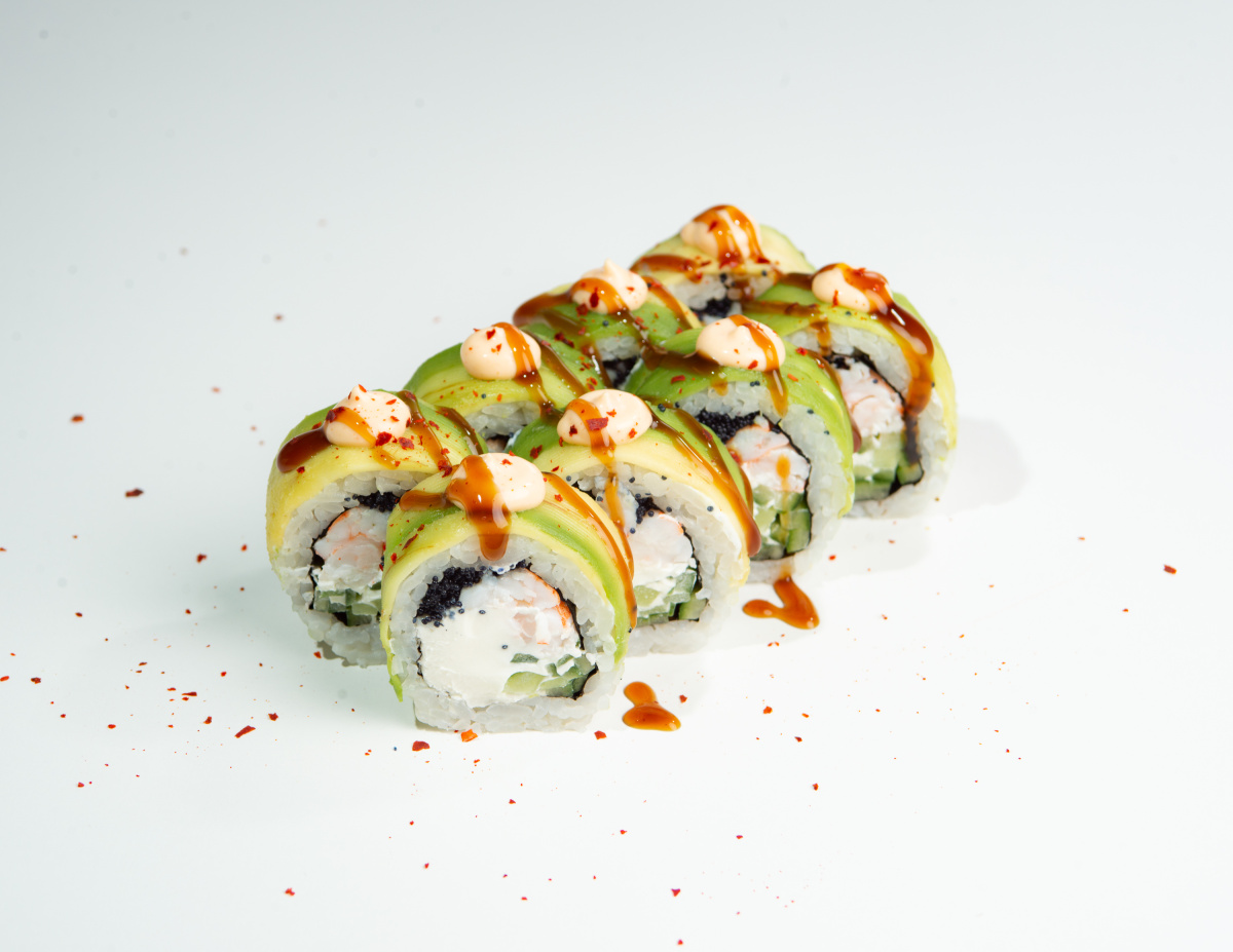 37.В авокадо с креветкой и чёрной икрой тобико(8шт)