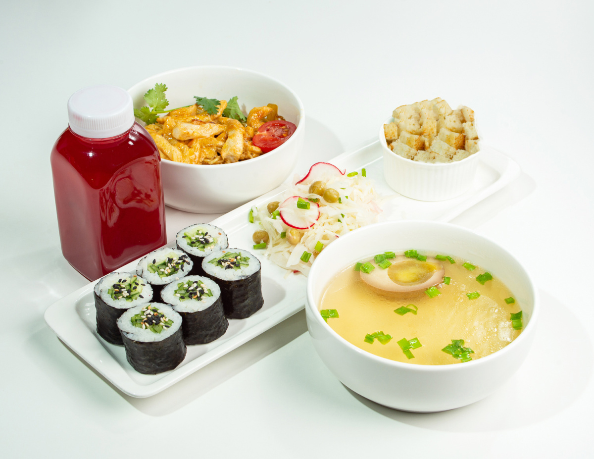 - Ланч №5: Бульон канта ни, салат, лапша карри, малый ролл с огурцом, морс