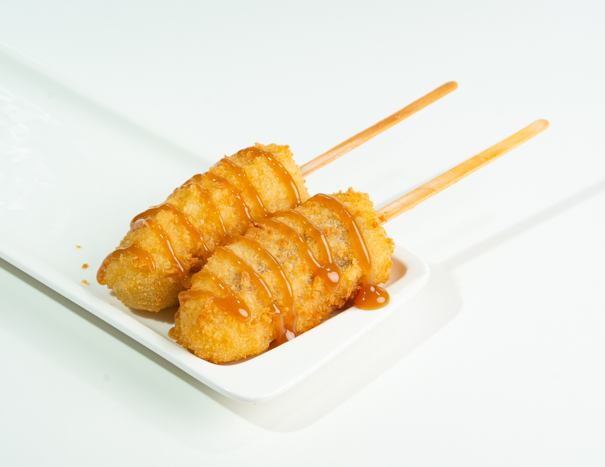 Банан, кляр, панировочные сухари, топпинг солёная карамель
