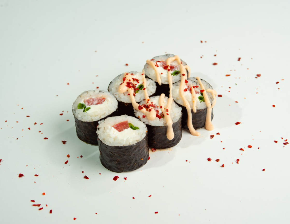 - 10.Малый ролл: помидор, сыр, зелёный лук, соус спайси (6шт)