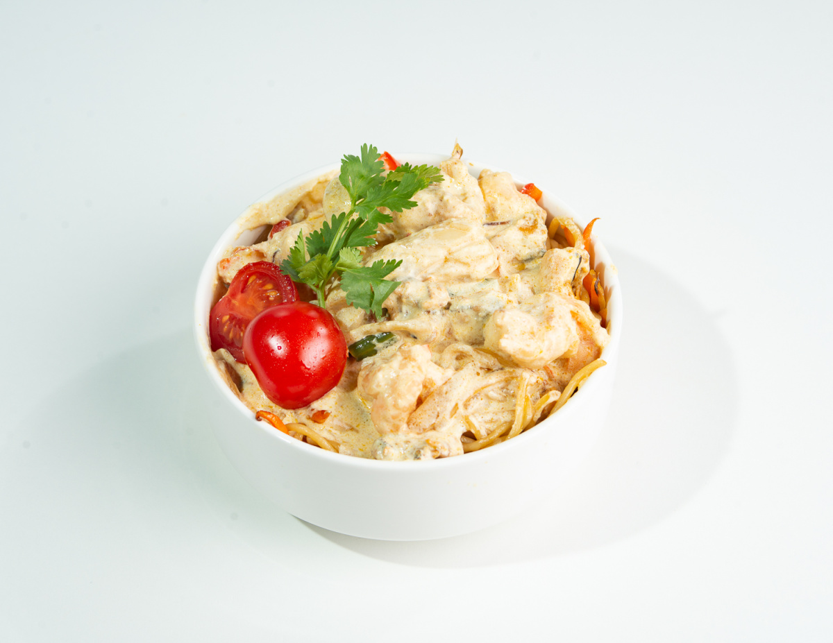 Лапша яичная, фасоль стручковая, перец болгарский, лук репка, мидии, креветки, кальмар, устричный соус, паста карри, соевый соус, сливки, помидорка черри, кинза