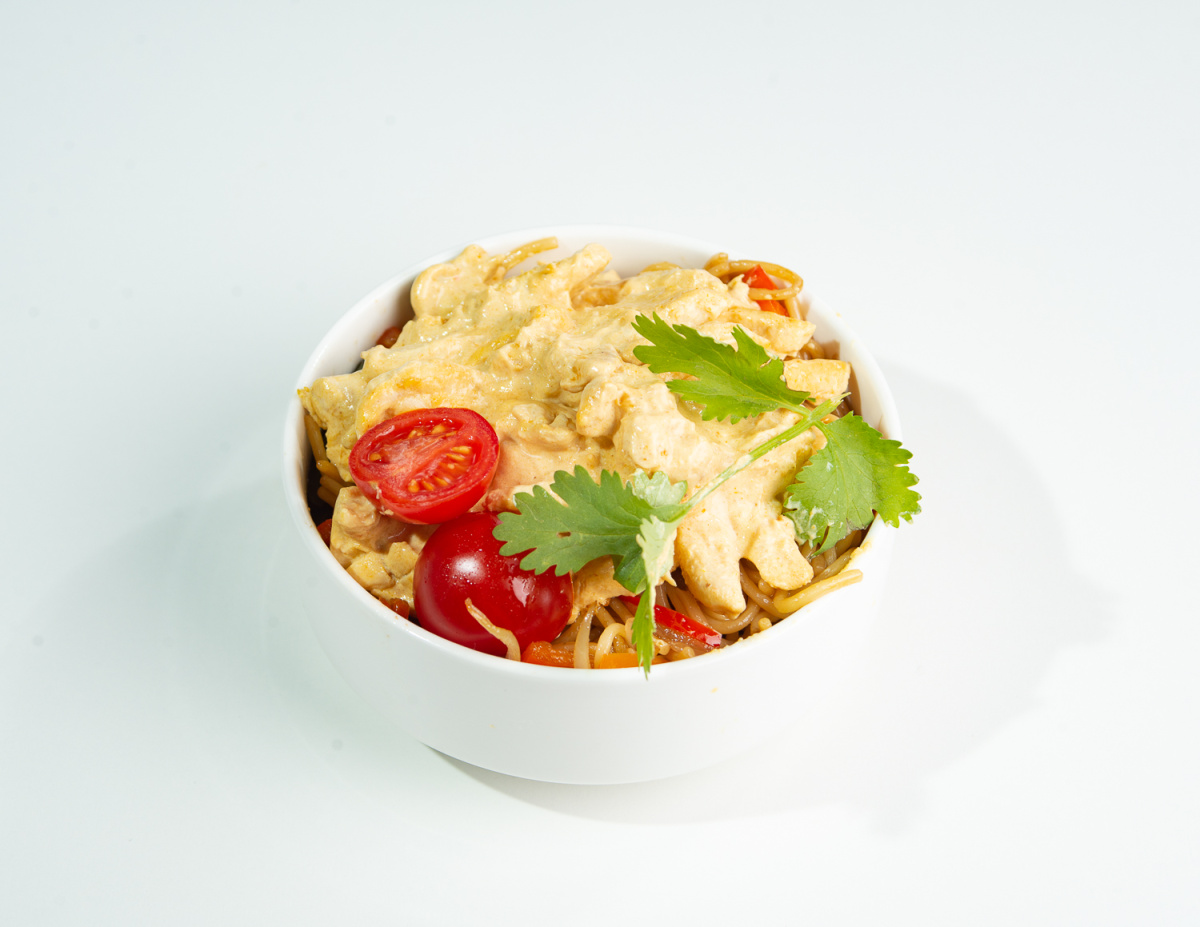 Яичная лапша, курица, соус карри, стручковая фасоль, болгарский перец, лук репчатый, чеснок, устричный соус, соевый соус, сливки, помидор черри, кинза
