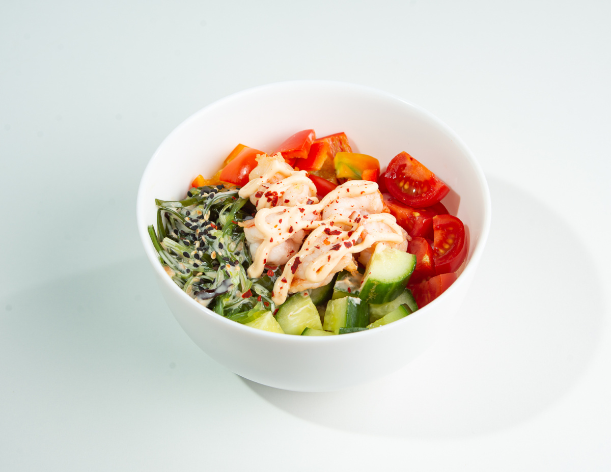 Рис, соус для боул, креветка, болгарский перец, помидоры черри, водоросли чука, огурец, ореховый соус, кунжут, соус спайси, посыпка чили