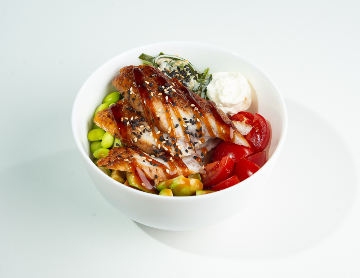 Рис, соус поке, угорь, авокадо, бобы эдамаме, помидоры черри, творожный сыр, водоросли чука, ореховый соус, соус унаги, кунжут