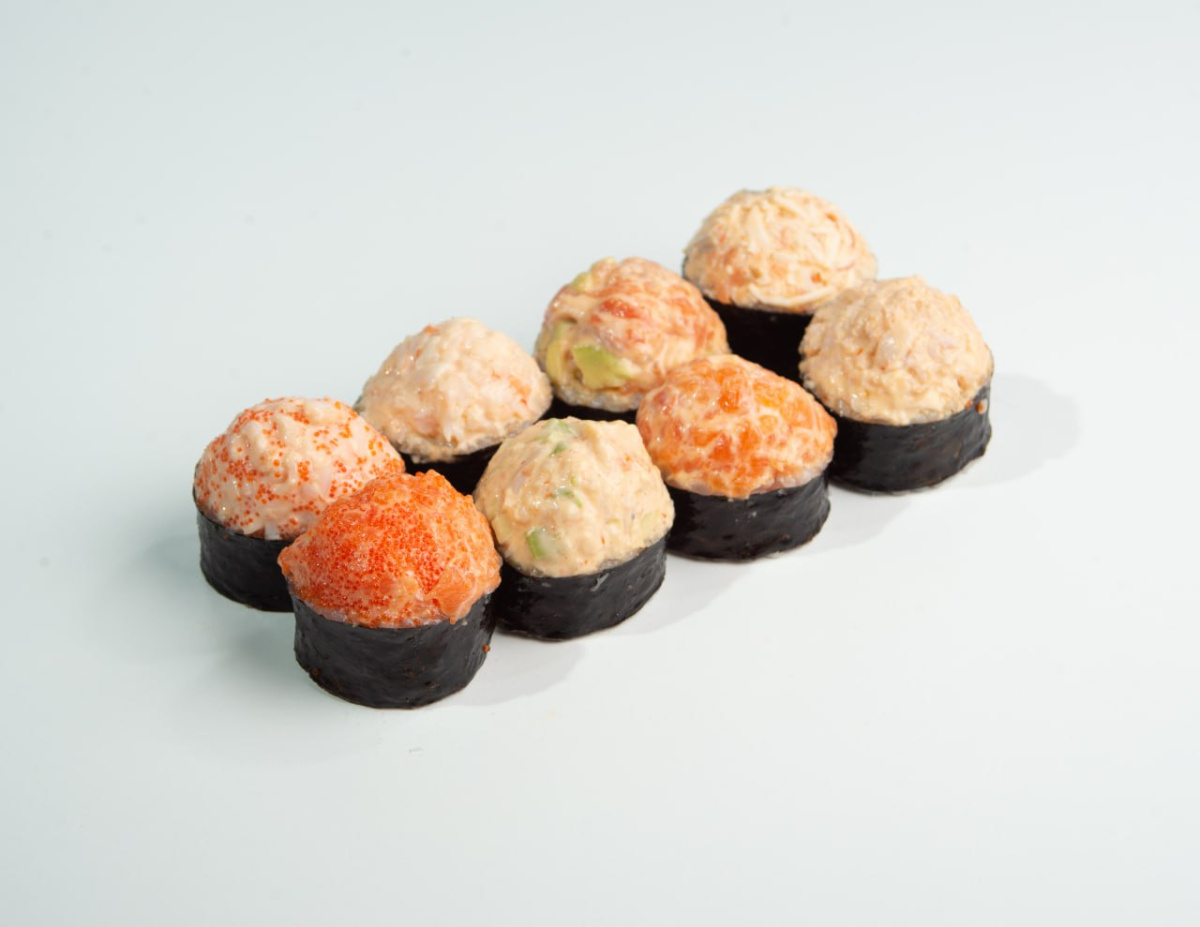 Рис, нори, омлет, творожный сыр, огурец, шапка: замес: лосось, соус спайси, авокадо, замес: креветка, соус спайси, авокадо, замес острый, замес: лосось, соус спайси, замес креветка, соус спайси, замес: лосось, икра тобико, соус спайси, замес креветка, соус спайси тобико, замес курица, соус спайси