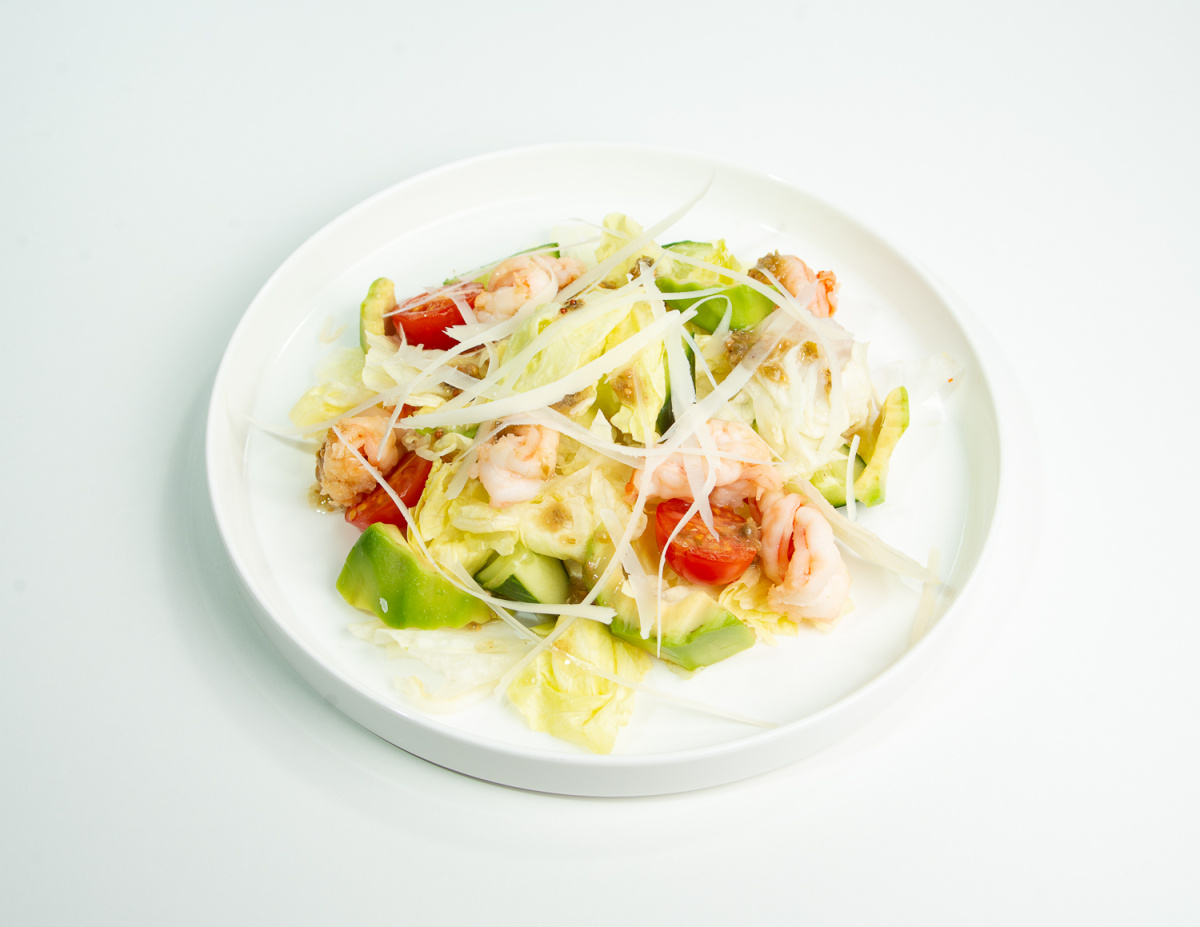 Салат айсберг, огурцы, помидоры черри, авокадо, креветки, соус китайский, пармезан