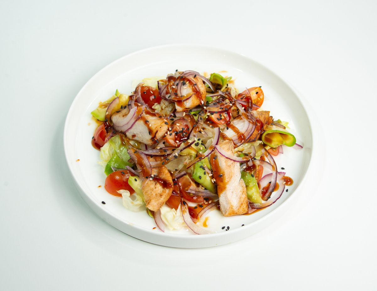 Микс салата, курица, помидоры черри, авокадо, красный лук, заправка, соус унаги, кунжут