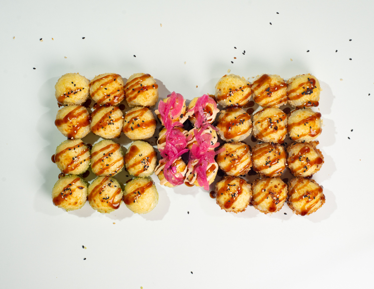 Малый запечённый шарики том ям (6 шт) (Рис, нори, тунец, творожный сыр, огурец, шарики том ям, шапка: сырный замес, соус унаги, кунжут)