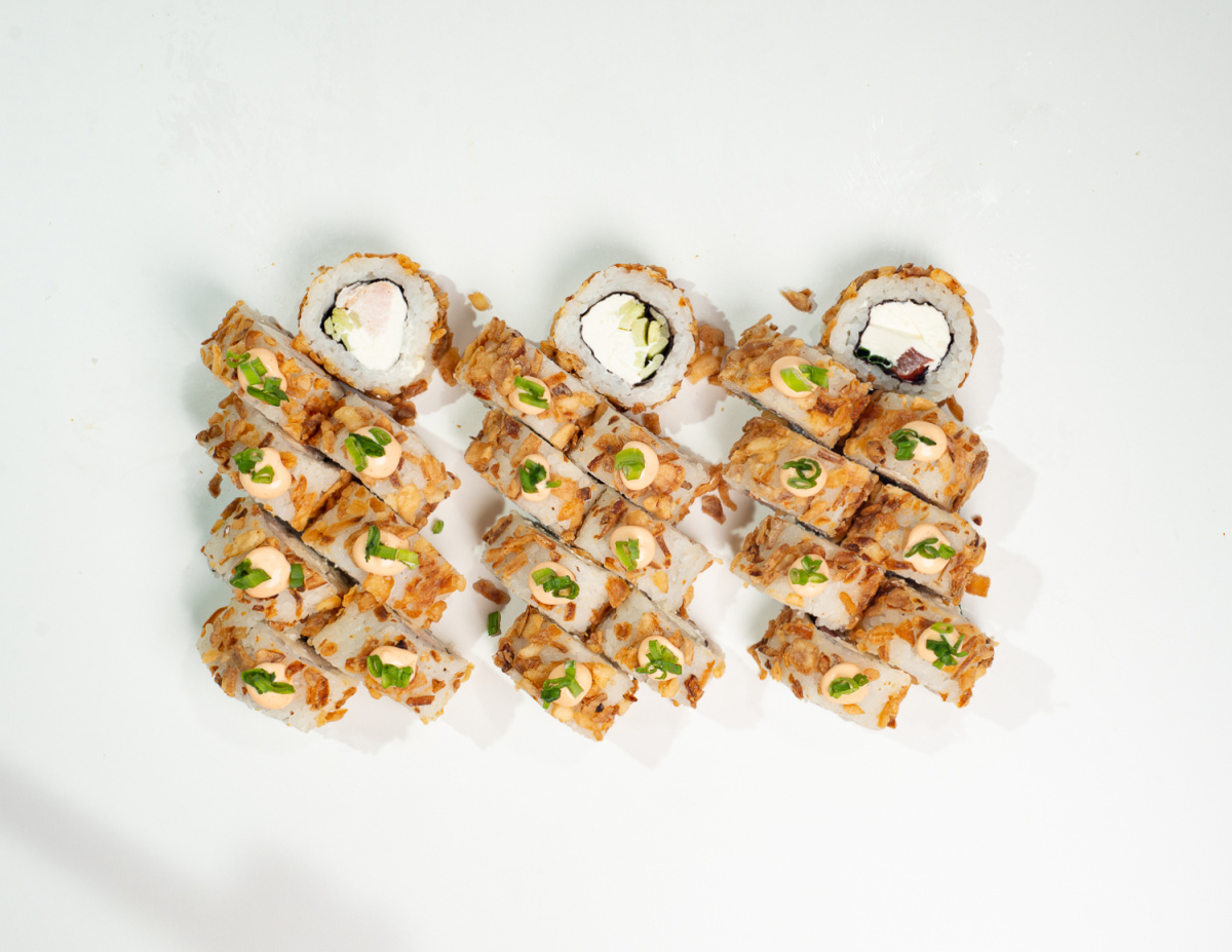 Большой ролл в жареном луке с помидором, зелёным луком, сыром и соусом спайси, зелёный лук (8шт)