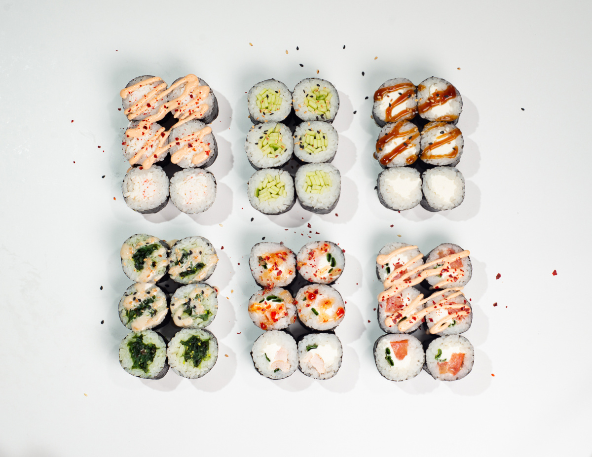 Малый ролл: с помидором, сыром и зелёным луком, соус спайси, посыпка чили (6шт)