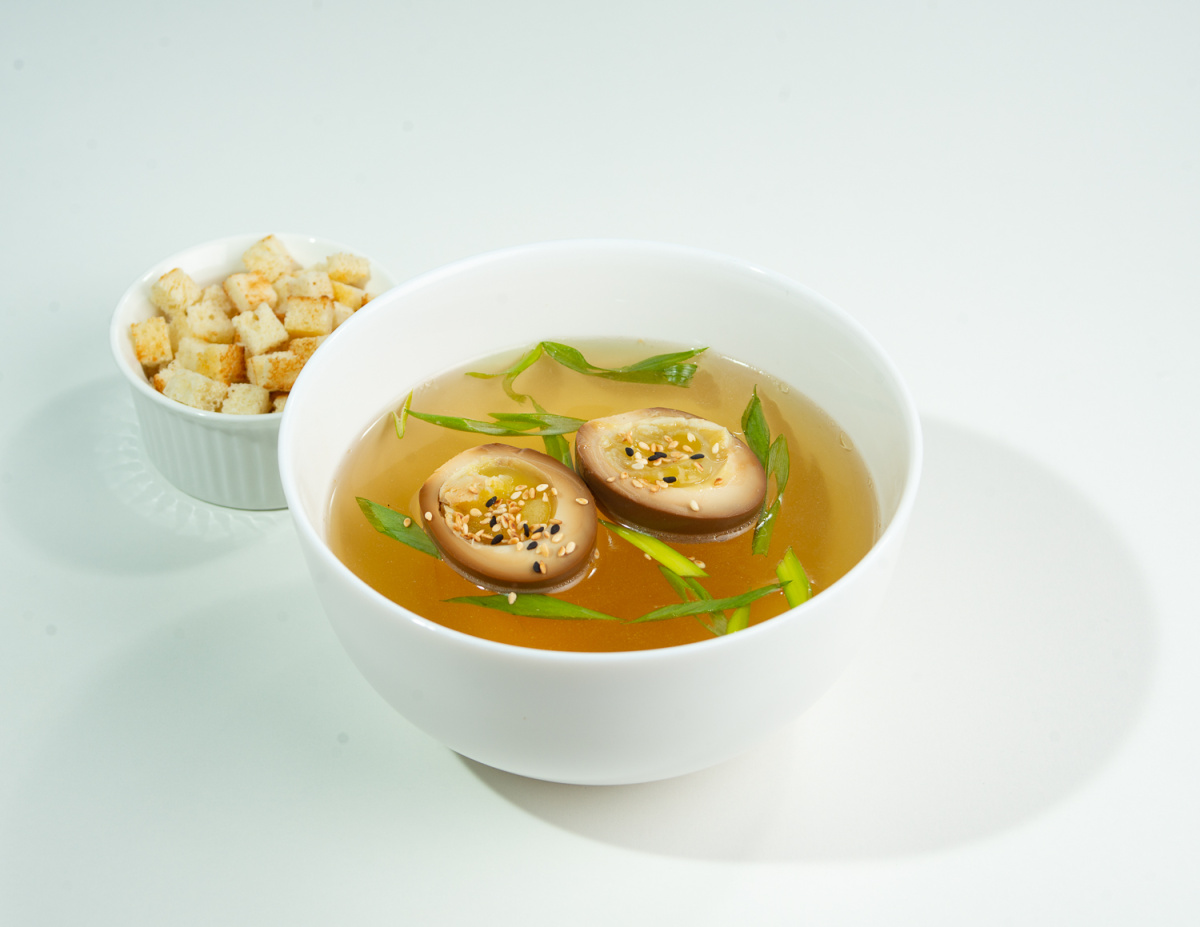 Куриный бульон, яйцо маринованное, зелёный лук, гренки