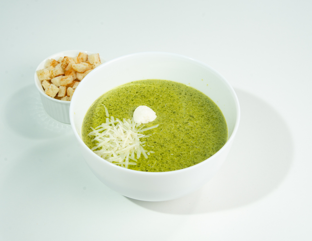 Шпинатный суп, сливки, сыр пармезан, творожный сыр, гренки