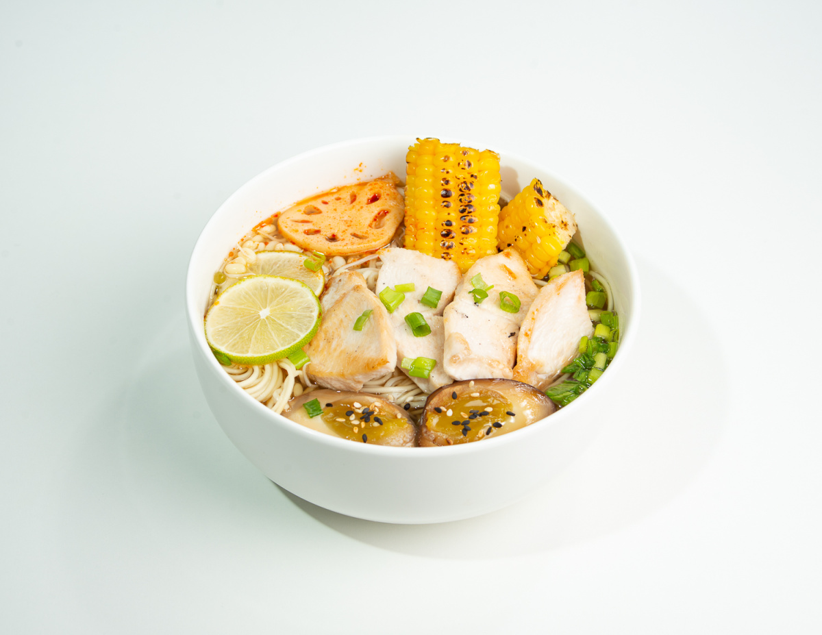Бульон, лапша яичная рамен, яйцо маринованное, кукуруза, проростки маш, корень лотоса, курица, зелёный лук, кунжут, лайм