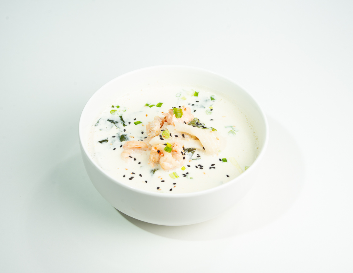 Бульон куриный, сливки, водоросли вакаме, хондаши, рыбный соус, креветки, кальмар, лосось, зелёный лук, кунжут