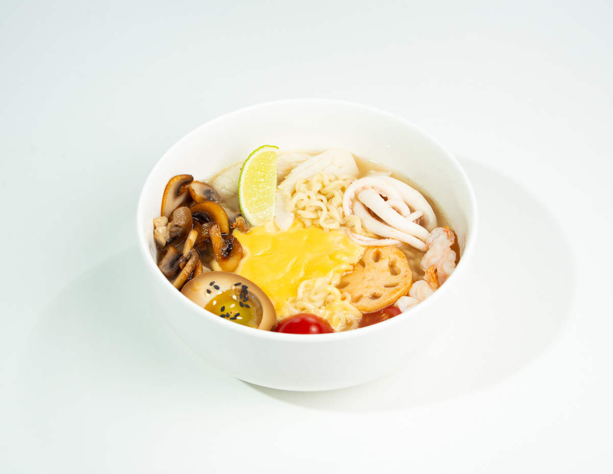 Бульон куриный, лапша, чеддер, щупальца кальмара, креветки, кальмар, помидоры черри. шампиньоны, корень лотоса, яйцо маринованное, лайм, кунжут