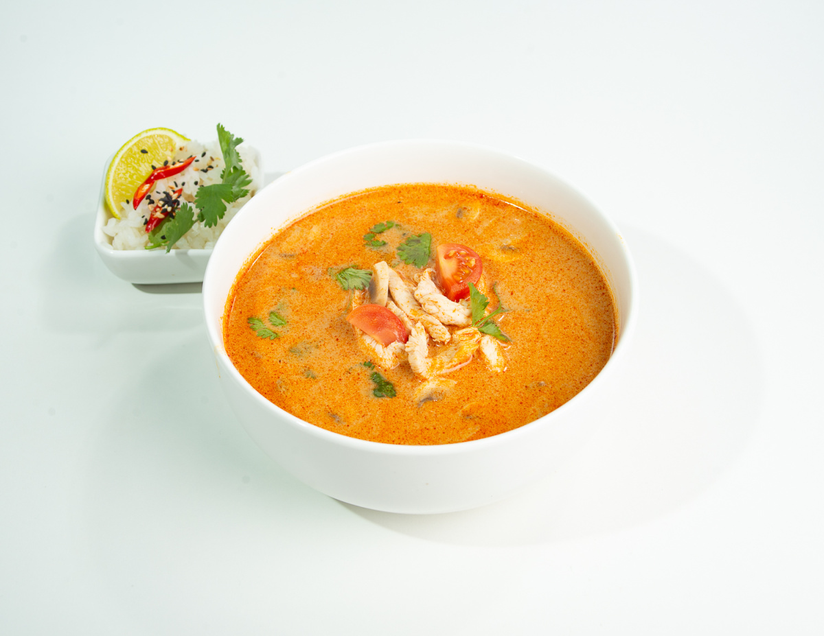 Бульон Том Ям, курица, рис, помидоры черри, перец чили, грибы, лайм, кинза, кунжут
