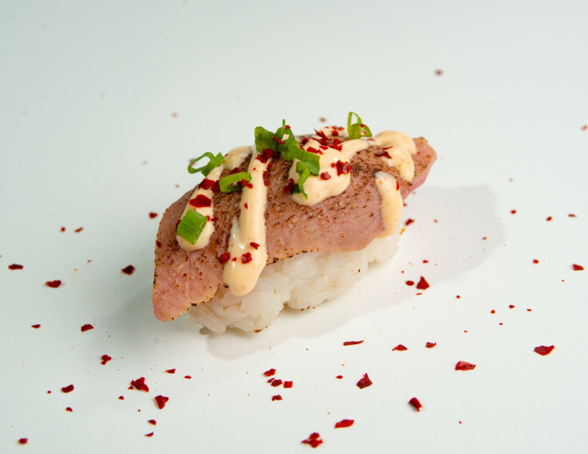 Рис, опаленный тунец, соус спайси, зелёный лук, посыпка чили