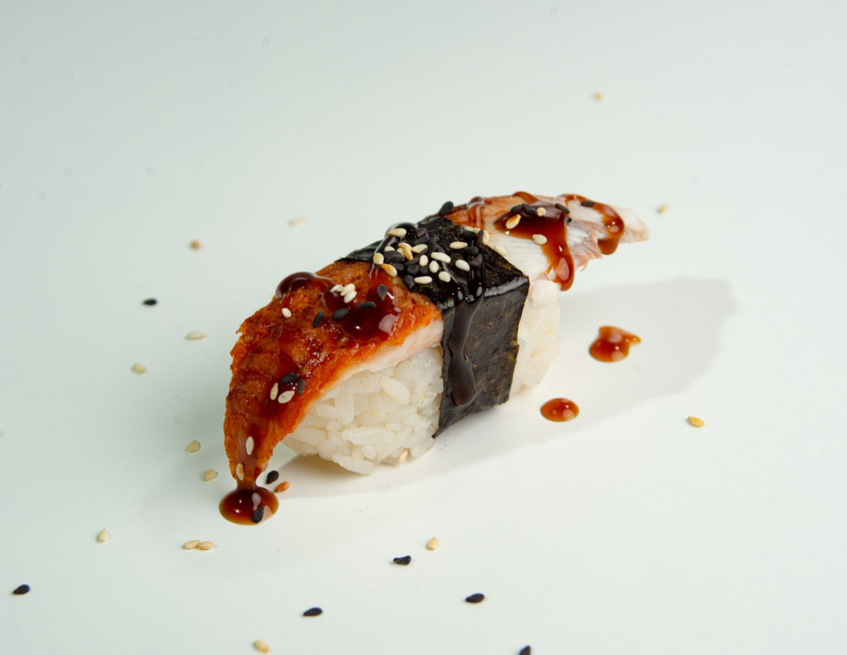 Рис, нори, угорь, соус унаги, кунжут